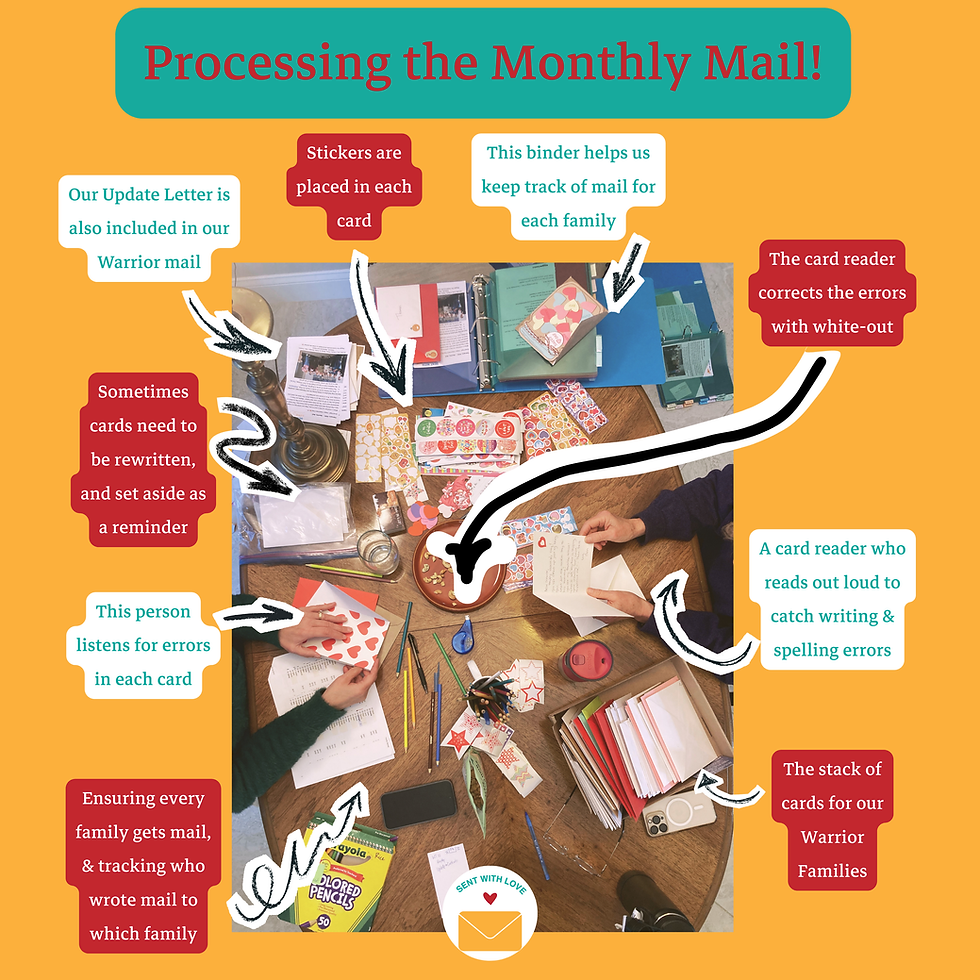 One person reads each card out loud so we can listen for writing or spelling errors. ✍️ 👂We receive mail from our Day In A Box initiative, as well as our monthly & quarterly card-writing groups. If something needs fixing, we correct it. We make sure every family receives mail, carefully track who wrote to whom, and sometimes set cards aside to be rewritten when needed. 🗂️💖